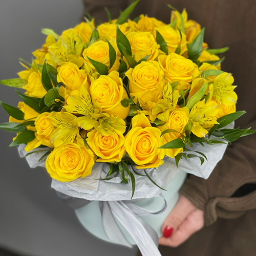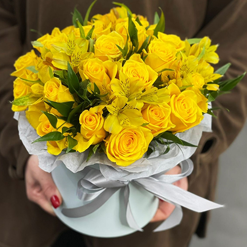Композиция в шляпной коробке "Розиль" из альстромерий и роз