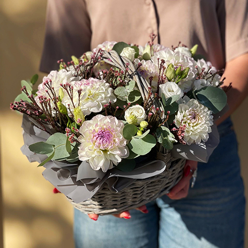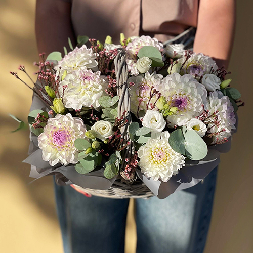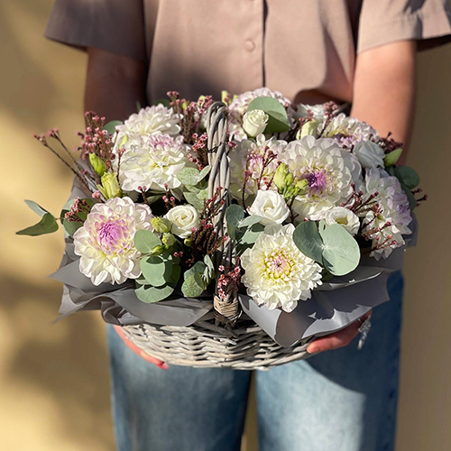 Композиция в корзине "Сюзи" из георгин, эустом и капса