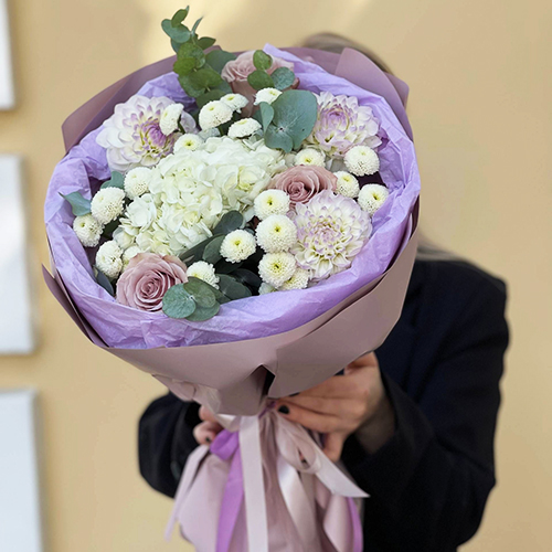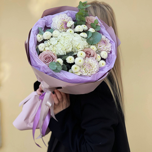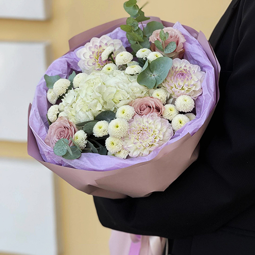 Букет "Динь" из георгин, хризантем сантини, эвкалипта, роз и гортензии