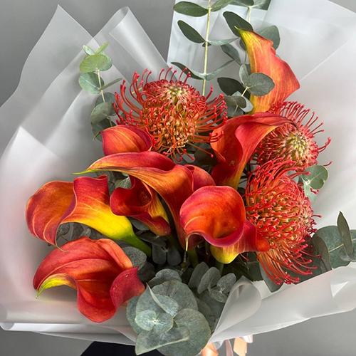 Букет "Империал" из калл, лейко и эвкалипта
