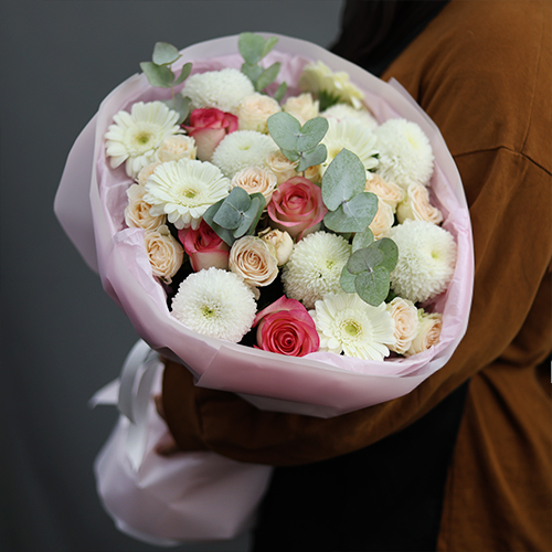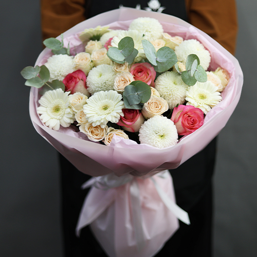 Букет "Пандора" из роз, эвкалипта, гербер и хризантем Момоко