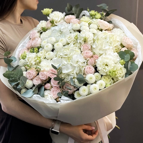 Букет "Пастелла" из кустовых пионовидных роз, Голландской Гортензии, эустомы, хризантемы Ньютон и эвкалипта