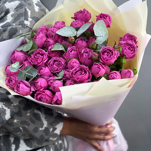 Букет "Малиновый бисквит" из кустовых и пионовидных роз и эвкалипта