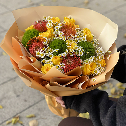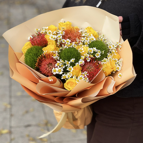 Букет "Зельда" из диантусов Lux, лимонных роз, лейко и ромашек